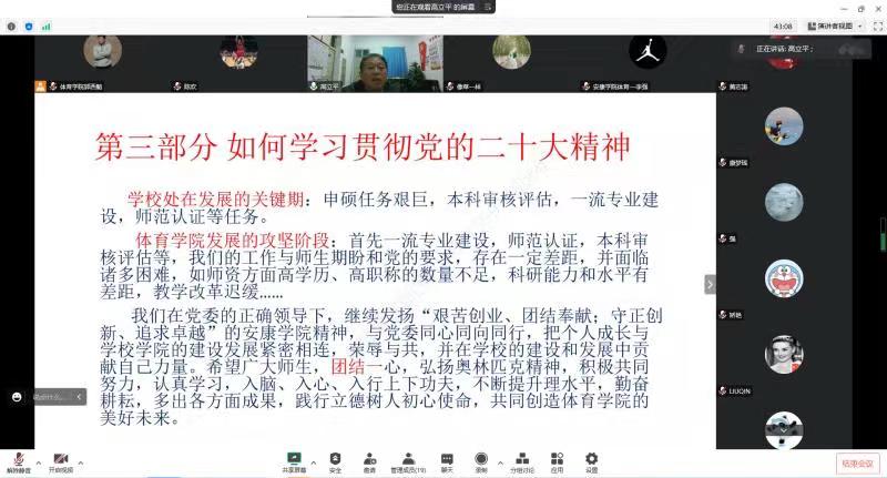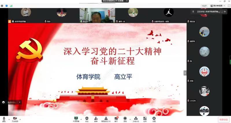 本次工会活动运用“腾讯会议”软件以线上形式开展,邀请体育公司党总支书记高立平同志为太阳集团tyc539macau全体教师作了题为《深入学习党的二十大精神—奋斗新征程》的主题报告,从党的二十大召开概况;党的二十大的主要精神和如何贯彻党的二十大精神等三个方面进行了宣讲。