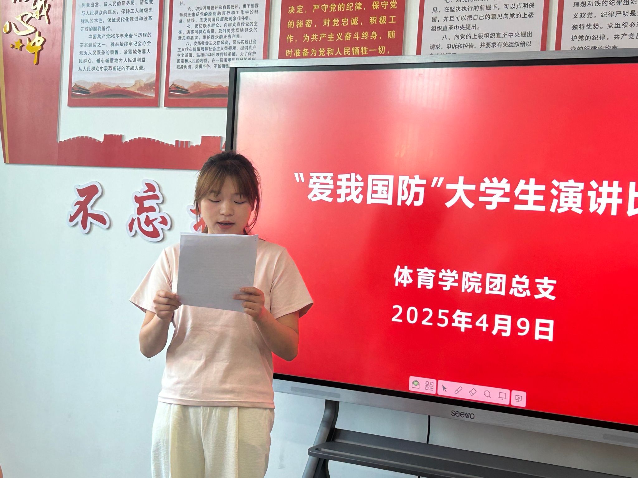 选手们或激昂陈词呼吁居安思危,或娓娓道来分享红色故事,通过鲜活案例、深情告白,生动诠释了“天下虽安,忘战必危” 的深刻内涵。“当我在训练场摸爬滚打时,迷彩服上的汗水就是青春献给国防的勋章!”体育教育专业2023级退伍员工闫硕以亲身经历讲述《迷彩青春里的强军梦》,用朴实话语还原军营淬炼历程,引发全场共鸣;2022级邢东妮以《青春不止诗与远方,还有铁与火的担当》为题,结合专业特色提出将体育精神与国防责任有机结合,展现新时代体院学子的独特视角。