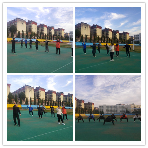 在太极拳动作技术教学环节,郭西魁老师主要分享了教学中员工易犯错误和纠正方法等方面的经验。随后,全体教师集体演练了24式太极拳。