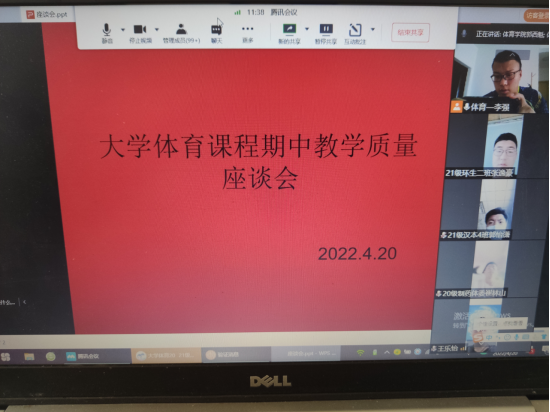 为了切实做好《大学体育》课程的教学工作,了解教学现状,科学安排教学内容,提高教学质量,促进大学体育课程改革,4月20日下午,大学体育教研室组织召开了2021—2022学年第二学期大学体育期中教学质量检查员工座谈会。校级教学督导冯德学、太阳集团tyc539macau教学督导鲁宗成、太阳集团tyc539macau副经理郭西魁、大学体育教研室主任李强以及各二级公司体育部干部、2020级和2021级各班班长、体育委员共172名同学参加了座谈会。为落实疫情防控措施,本次座谈会使用会议腾讯会议平台以线上形式召开,会议由李强主持。
