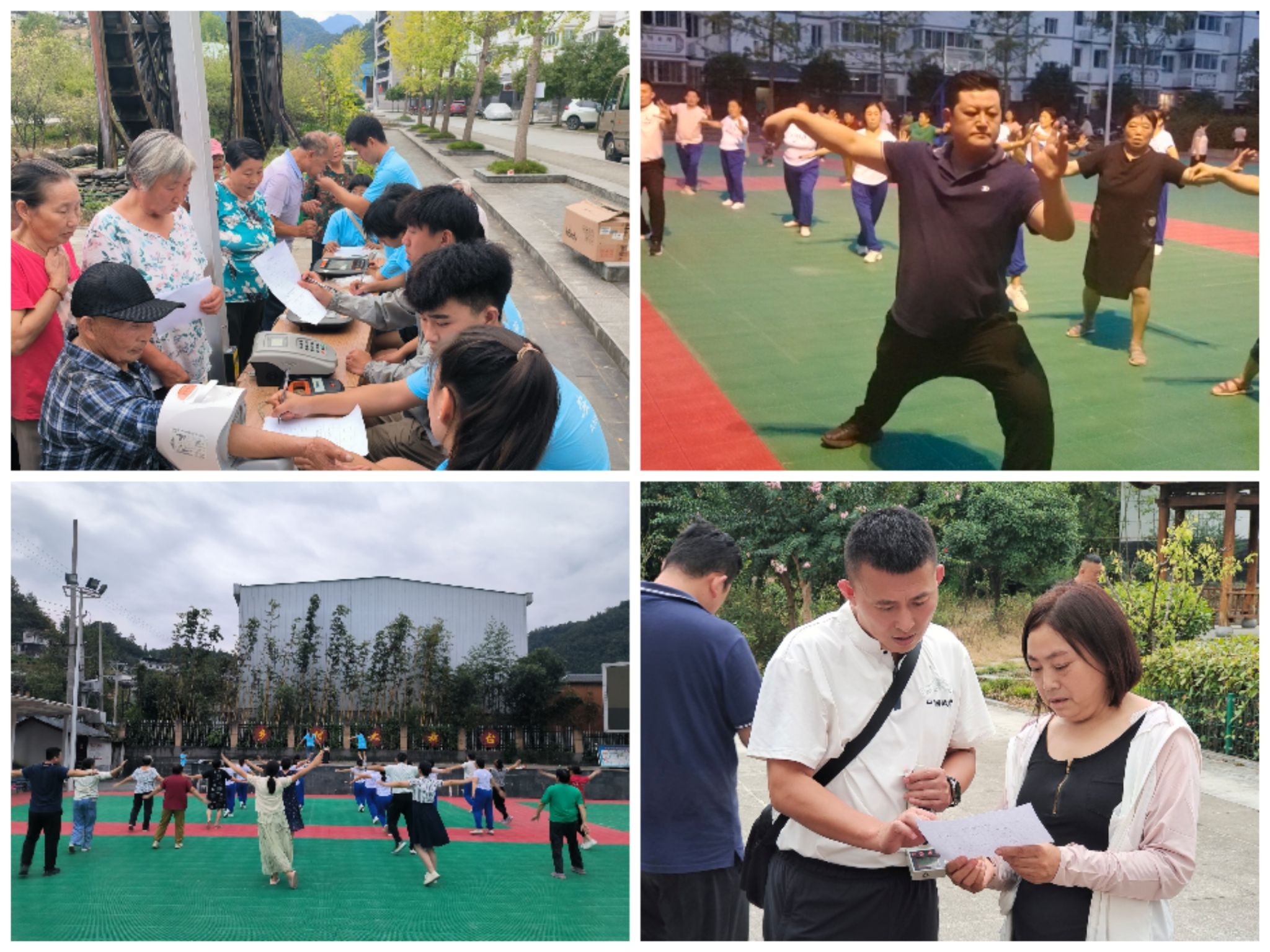 “基层群众健康指导服务”实践团队依托体测仪器,从身高、血压、握力、肺活量、体成分仪等方面为群众进行了健康指数测试,并运用专业知识对测量的数据进行个性化分析,对群众的生活起居、运动锻炼、膳食营养等方面给予切实可行的健康指导;“基层全民健身运动推广”志愿服务团队向群众展示了充满活力的健身操和传统武术太极拳,并分阶段进行了现场教学,活动现场气氛热烈,群众积极参与互动。
