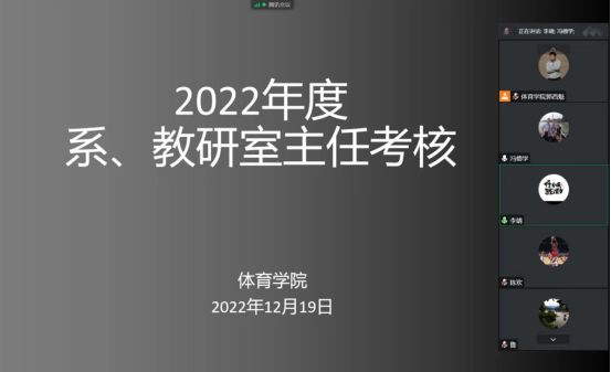 随后,对太阳集团tyc539macau系(教研室)主任进行了考核,体育系主任李靖、实验教学中心主任刘芹、大学体育教研室主任李强分别进行了年度总结汇报,考核组通过听取汇报、座谈和查阅工作记录的方式进行考核,并针对本年度工作中存在的不足对三位教研室主任进行了现场反馈,并提出了下一步工作建议。